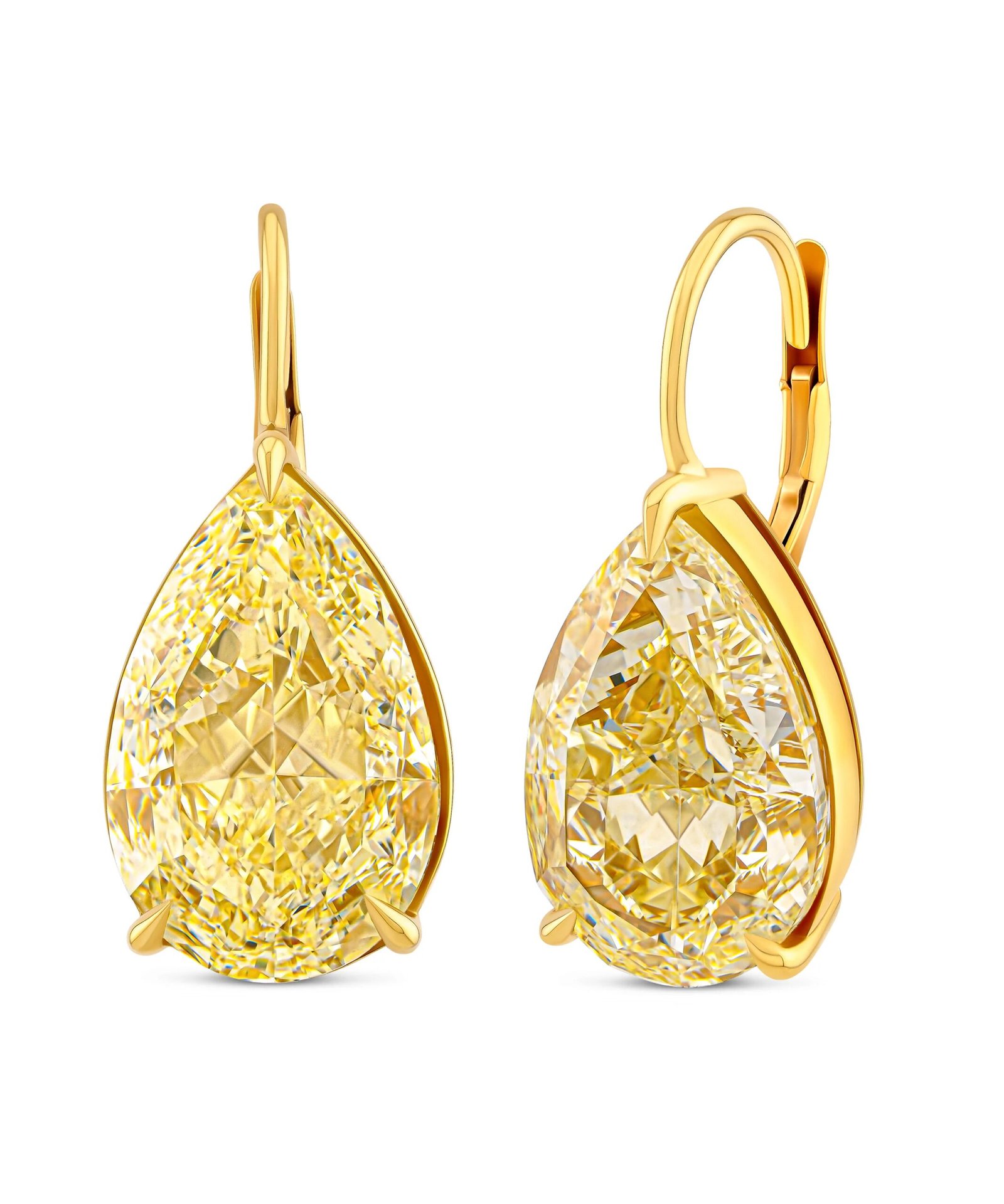 Turn heads with 19.80 carats of fancy yellow pear-shaped lab-grown diamonds, set in sleek prong set, 18k yellow gold mountings. These drop earrings blend timeless glamour with modern edge – luxury made unforgettable.
