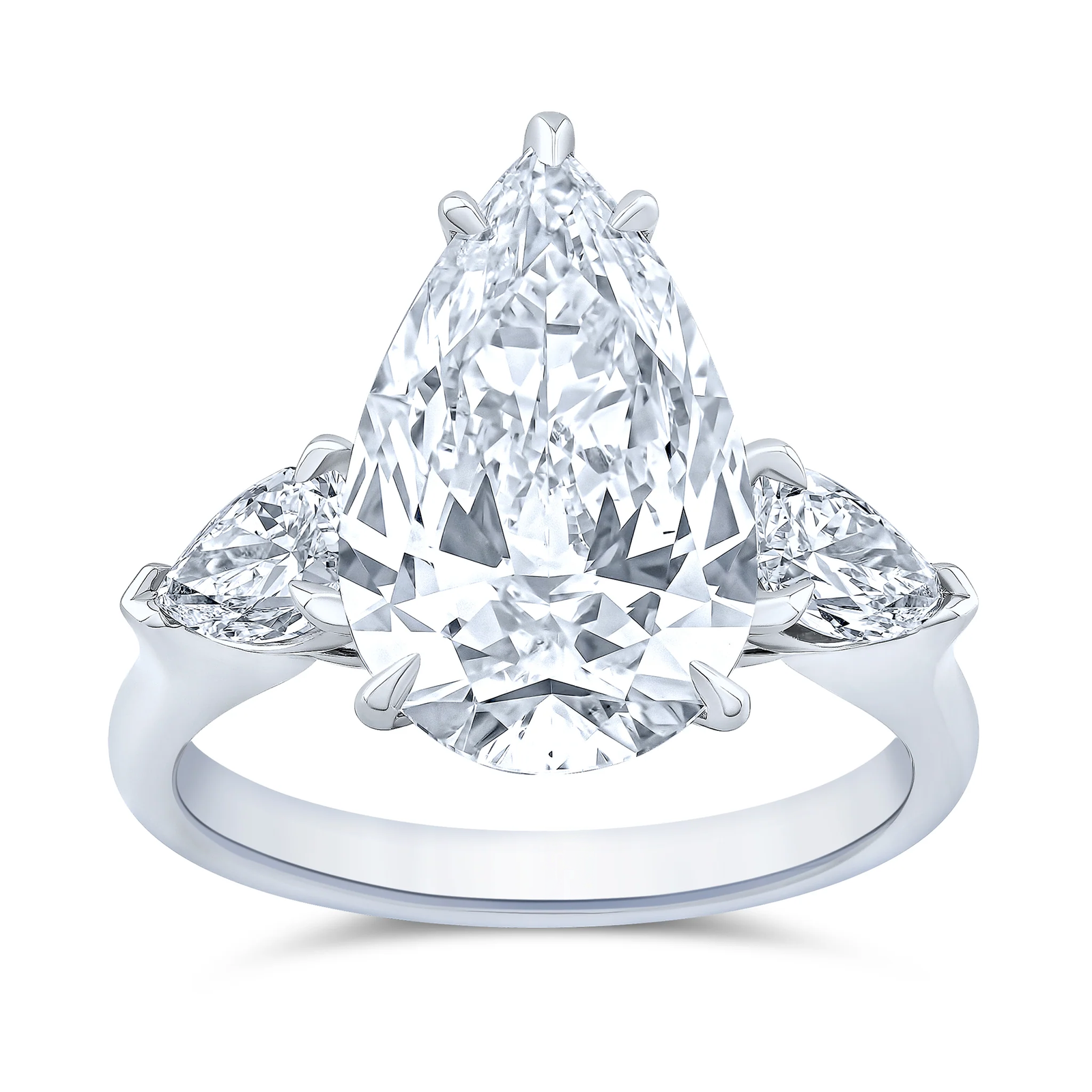 A breathtaking 4.59 carats pear-shaped lab-grown diamond takes center stage, its graceful silhouette shimmering with fire and brilliance. Two perfectly matched side stones, totaling 0.81 carats, frame the centerpiece in timeless harmony. Set in sleek platinum, this three-stone design embodies both elegance and enduring craftsmanship.