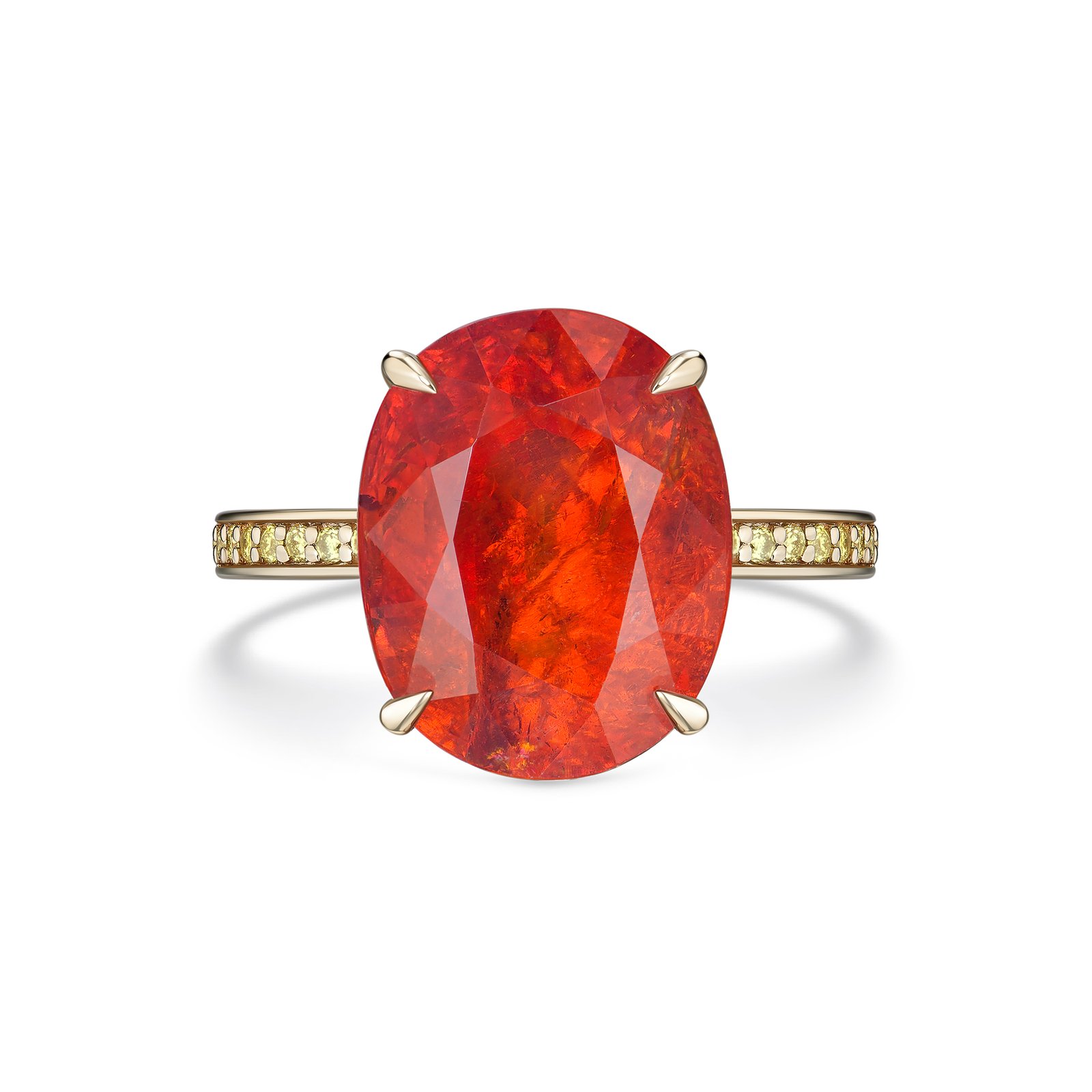 A vibrant 8.3 carats earth-mined oval spessartite commands attention with its fiery brilliance. Accented by glowing yellow diamonds along the band and set in 18k yellow gold, the design radiates warmth and intensity. A rare creation that celebrates the beauty of vivid color and fine craftsmanship.