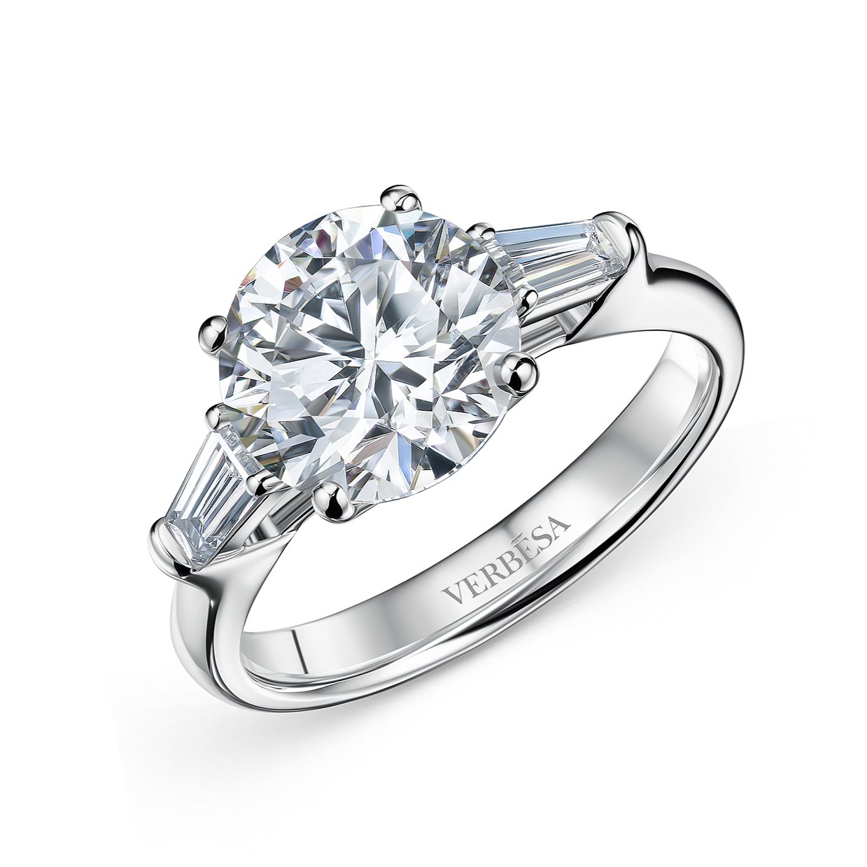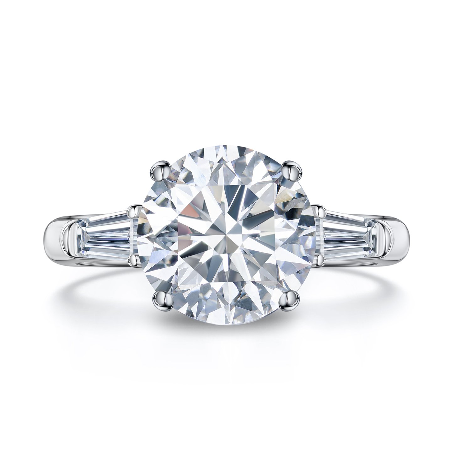 A luminous 4 carats round brilliant lab-grown diamond commands attention at the heart of the ring, its sparkle intensified by sleek baguette side stones. The slender platinum band offers a modern, understated setting that highlights pure gemstone beauty. This ring is an elegant testament to enduring love and refined taste.