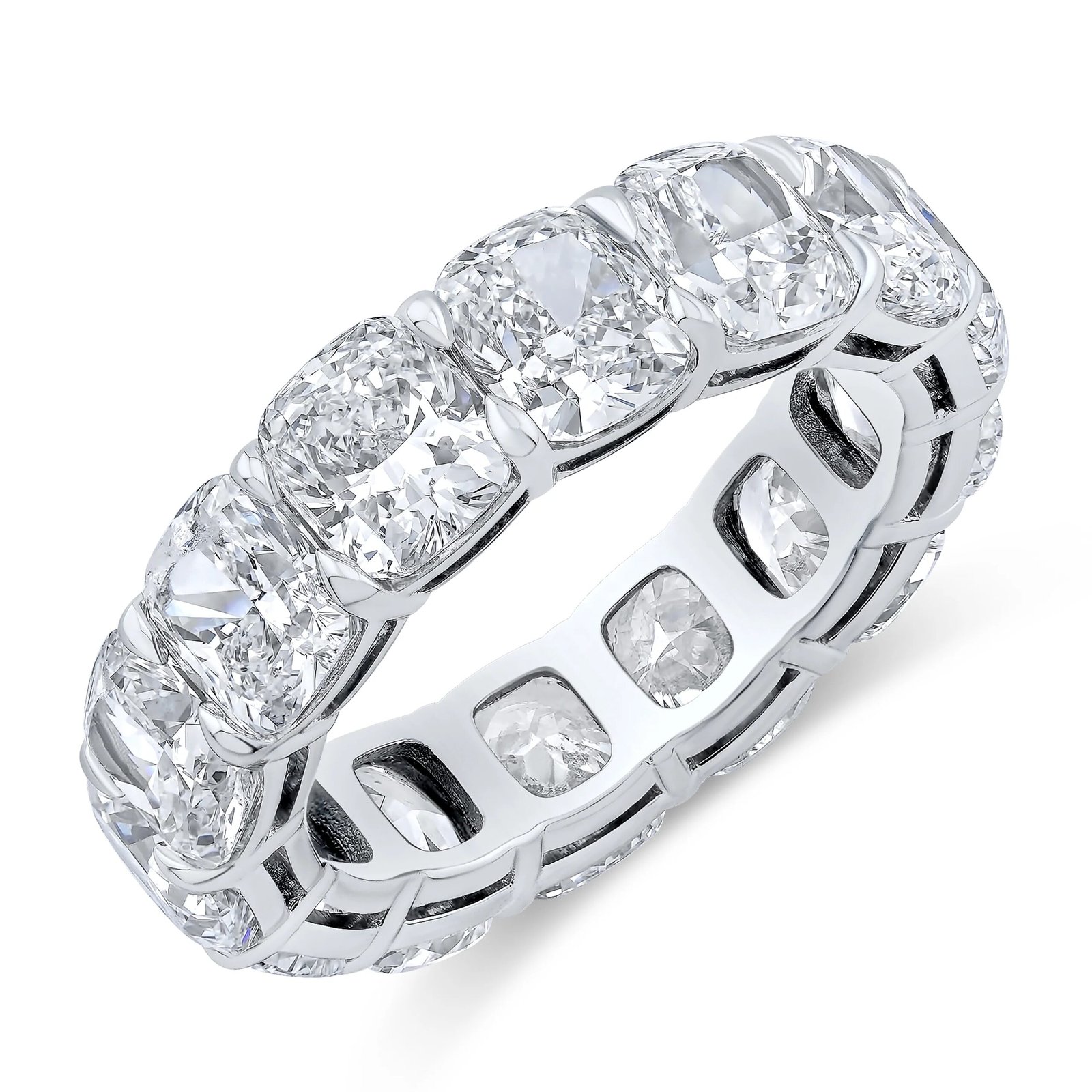 A flawless row of cushion cut lab-grown diamonds wraps the finger in soft, radiant brilliance. The polished platinum band frames the gems with quiet elegance, letting their luminosity shine. This eternity ring is a refined celebration of timeless love.