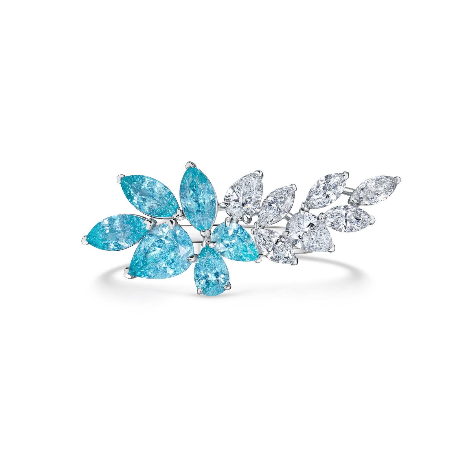 A dazzling cocktail ring in a floral motif, featuring the vivid neon glow of lab-grown Paraiba Torumalines alongside brilliant lab-grown diamonds. Set in platinum, the design captures nature’s beauty with exquisite detail. A delicate pavé shank adds an extra layer of sparkle, enhancing its radiant allure.