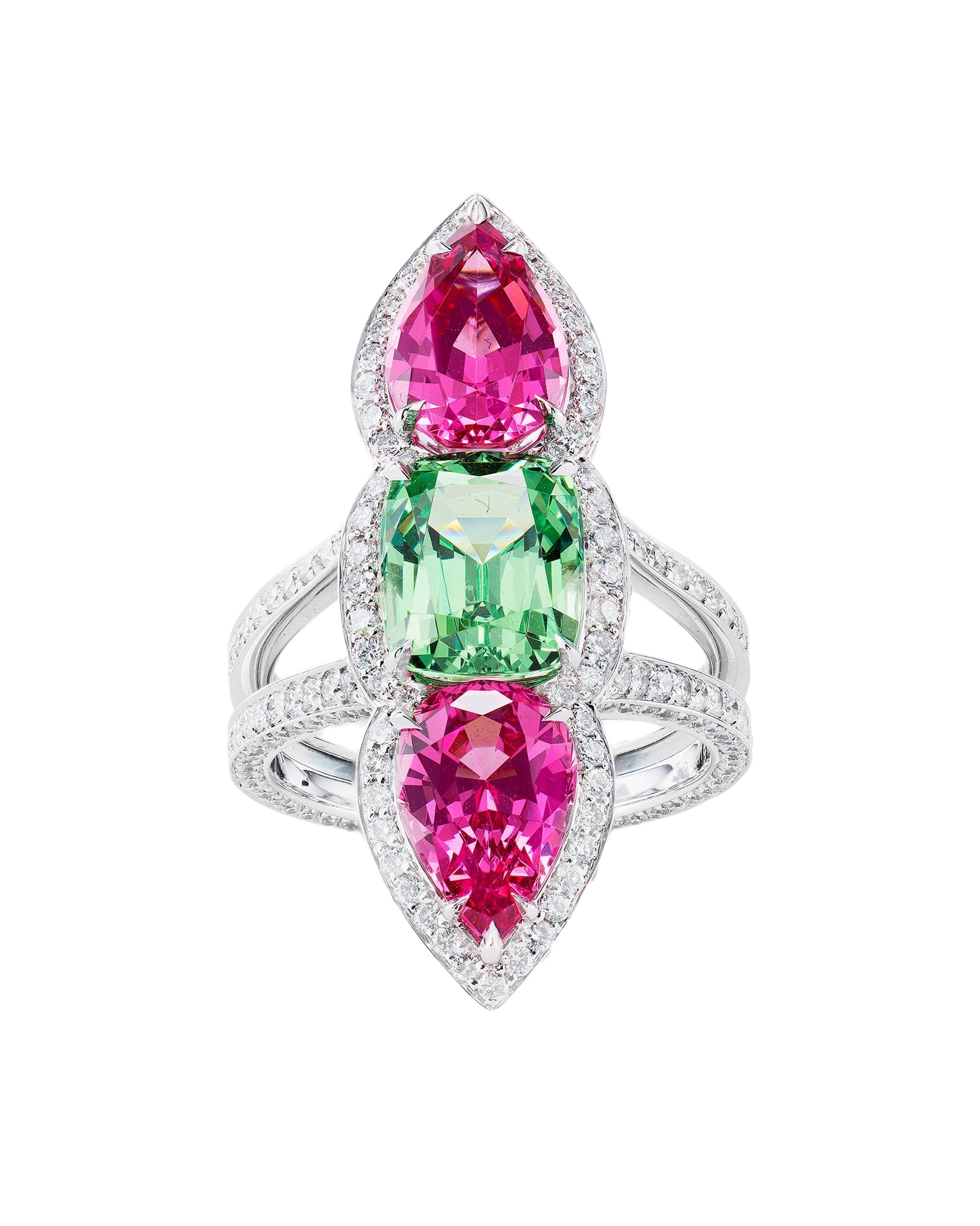 Home / Rings / Cocktail Rings / Three Stone Earth-Mined Spinel, Mint Garnet and Diamond Ring