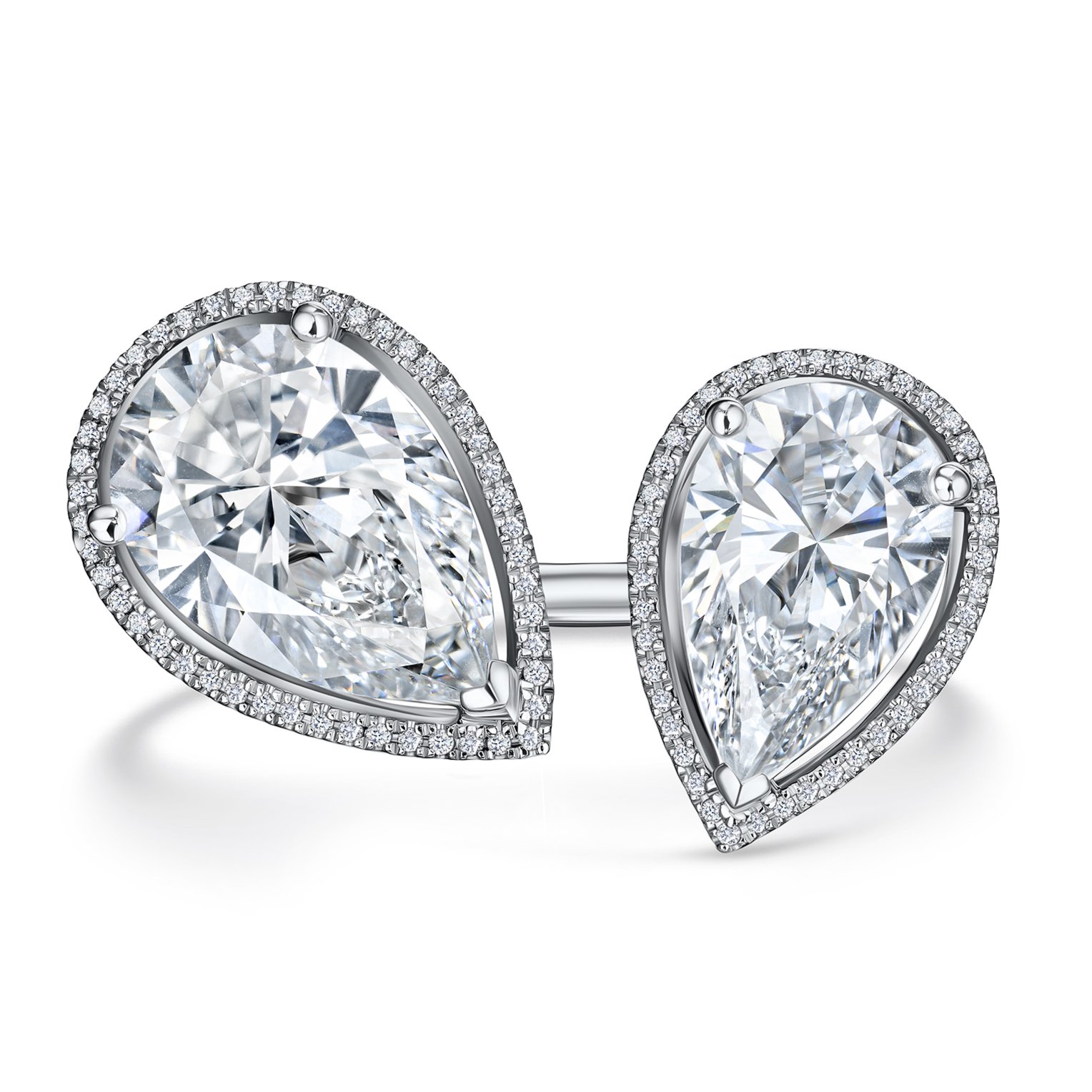 A dramatic toi-et-moi design where two pear-shaped lab-grown diamonds entwine in a delicate embrace, creating a dance of light. The elegant platinum band recedes into the background, letting the dual gems command the spotlight. This ring is a bold celebration of unity, contrast, and timeless romance.
